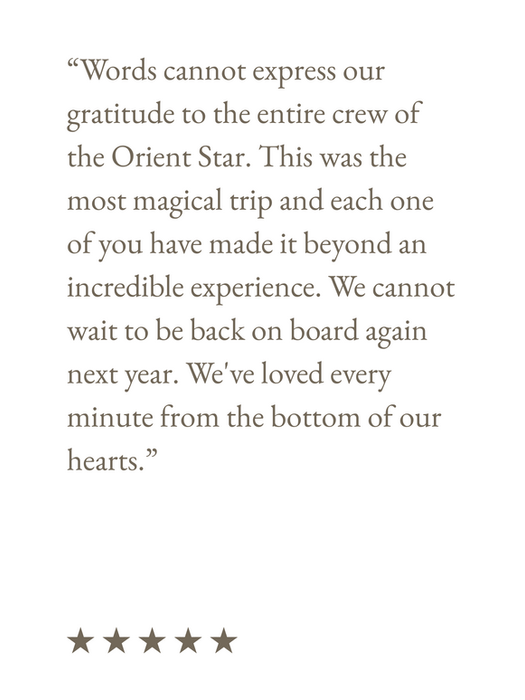 My heartfelt thanks to the entire Crew of the Orient Star — without exception you are all so professional, but also so relaxing and fun to be with!!! Your standards are the highest, but you manage to create a very warm and relaxing home for your guests in the beautiful waters of the Med. Each day was different and each special in their own way.